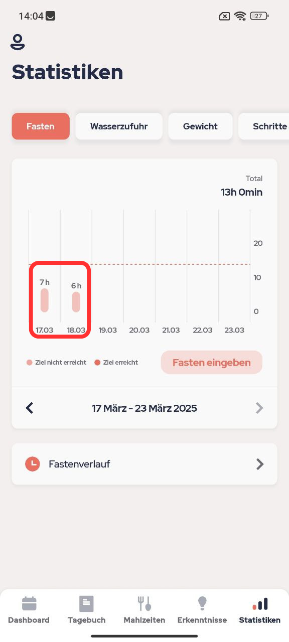 Um Ihr Tagesziel auf der Registerkarte 'Statistik' zu erreichen, müssen Sie an einem Tag so lange fasten. Sie können Ihren aktuellen Fastenverlauf auch jederzeit in Ihrem Profil überprüfen.