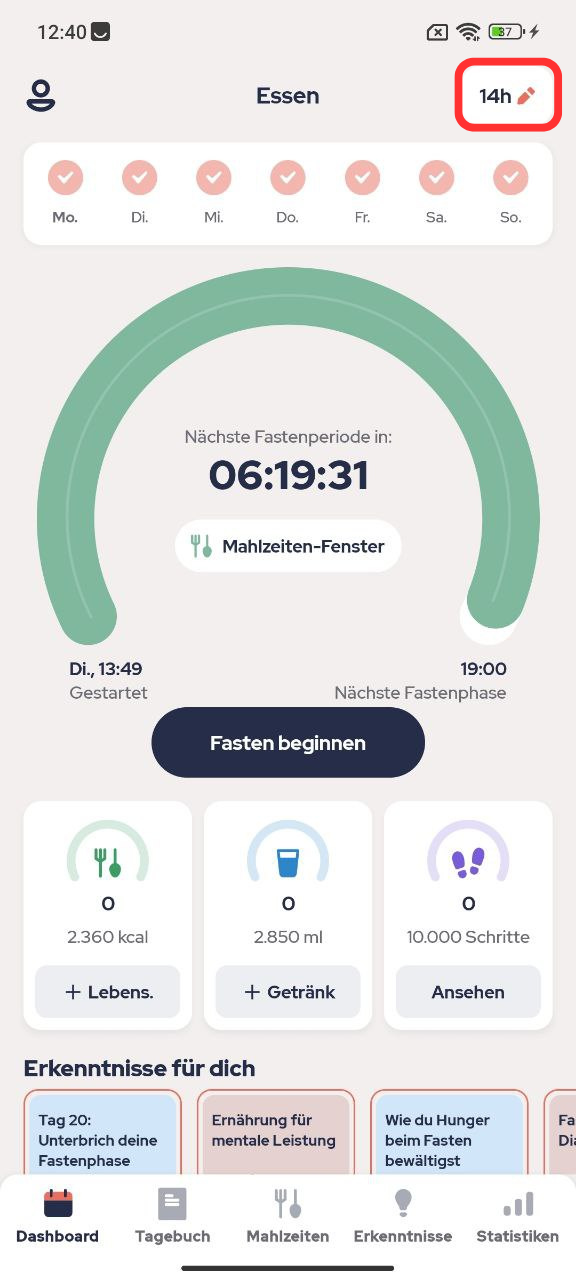 Wenn Sie Ihr Essensfenster ändern möchten, gehen Sie bitte auf die Registerkarte 'Timer' und klicken Sie auf den Fastenkreis in der Mitte des Bildschirms: