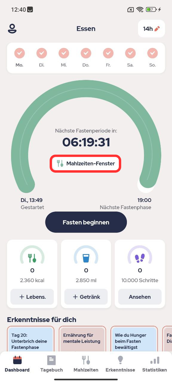 Danach können Sie Ihr Essensfenster mit den Schaltflächen + und - ändern. Sie können auch Ihre Fastentage festlegen, indem Sie sie anklicken: